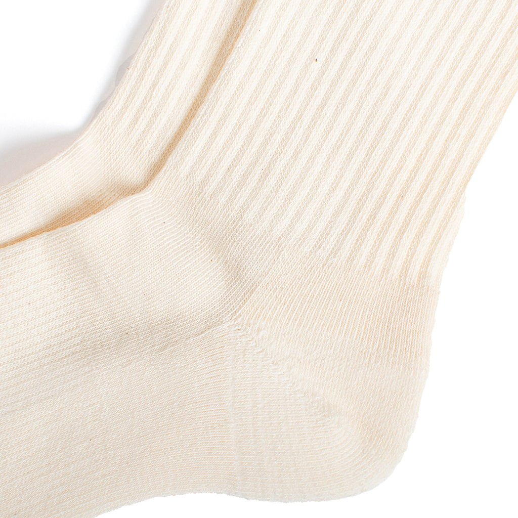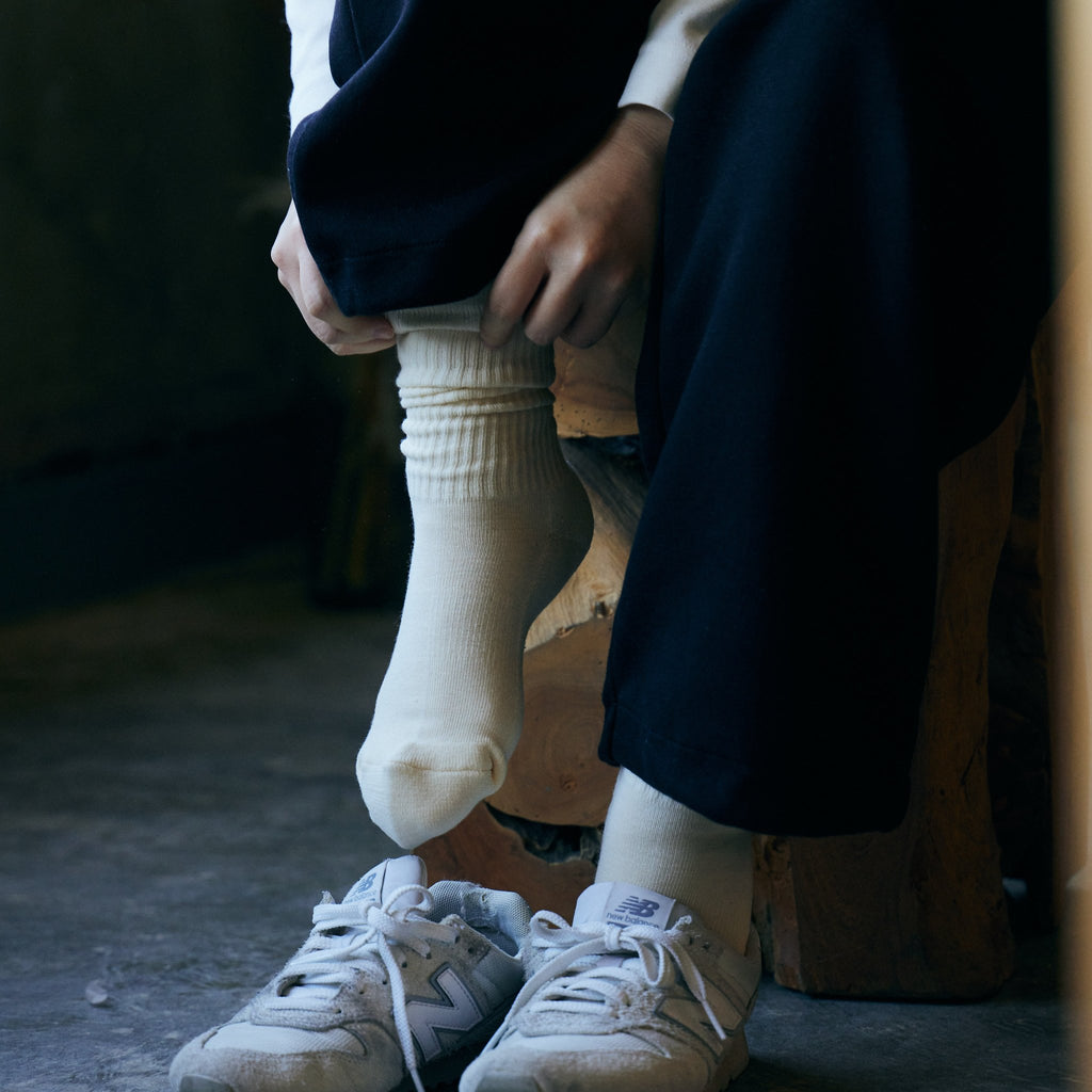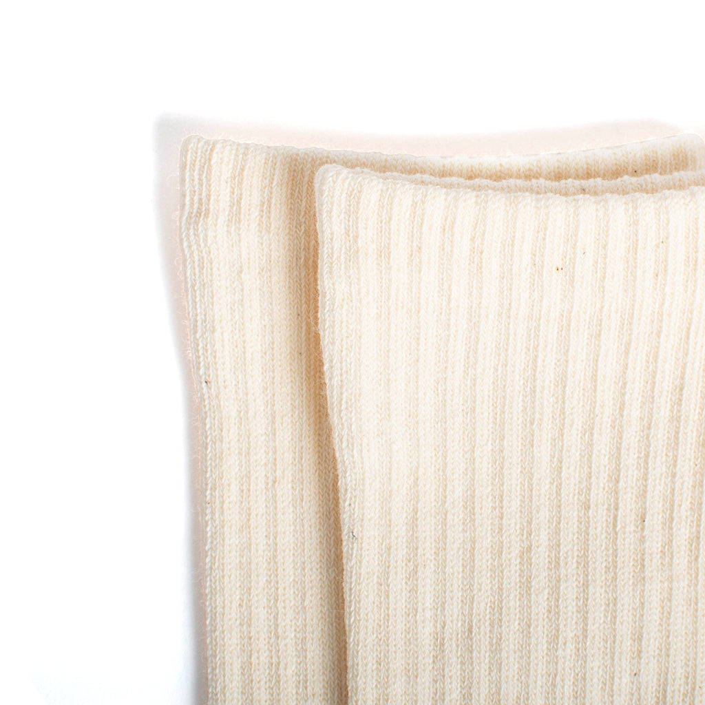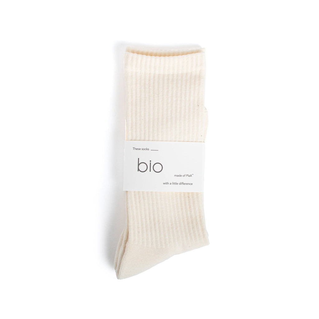 PlaX™を編み込んだシンプルなクリームカラーの靴下。